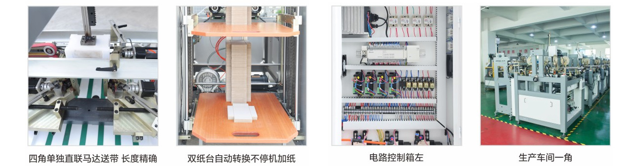 1.飛達(dá)送板:更適合對厚板,薄板、變形板,特大板,開槽板的四角貼角。有紙盒下拉與自動定位機(jī)速度自動匹配功能,